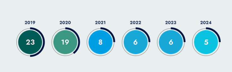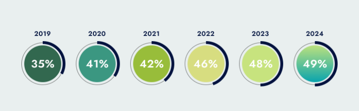 2019: 35%,2020: 41%,2021: 42%, 2022: 46%, 2023: 48%, 2024: 49%
